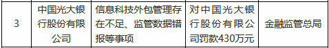 9月12日金融一线讯息,国度金融监督不停总局行政处罚信息公示列表浮现,中国光大银行股份有限公司因信息科技外包不停存在不及、监管数据错报等事项,被罚金430万元。