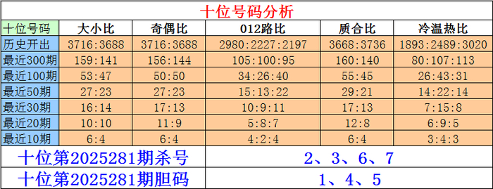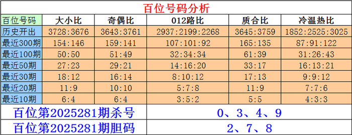 摆设三第2025278期-第2025280期差别开出奖号:627、375、539。 界说:热码:遗漏0-4期;温码:遗漏5-12期;冷码遗漏12期以上。 近期百位大号进展较冷,上期大号出现之后,近期合乎关心大号转热,展望相接开出;该位奇号较着较热,现在相接开出2期,短期内不会转冷,本期再额混名。百位本期杀号:0349,胆码关心:278。 近期十位奇数出现较少,最近2期连出,较着转热,本期看好再额外数;该位温冷号码近期出现较少,现在轮空1期,本期防温冷号码再次解冻。十位杀号:2367,胆码关心: